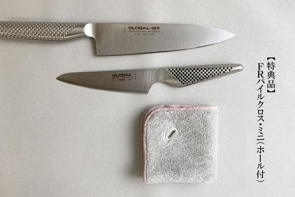 食欲の秋、お料理時間が増えてくる季節ですね。 切れ味の良い包丁なら、料理がさらに楽しく快適に。 そこで、今月はグローバル包丁(イスト、セット商品含む)をお買上げで 「FRパイルクロス・ミニ(ホール付)」をプレゼント! 洗って使うを繰り返す包丁ですが、こんな小さなクロスがあると便利です。 また、ホール付きだからフックにぶら下げて、包丁専用クロスとしてサッと拭くのにもよさそう。