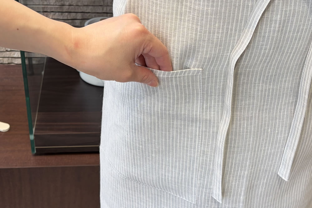 薄地の高級リネンで仕立て、軽やかに着用いただけます。 アイスグレーに白く細いラインが入っています。 コントラストも控えめなので、どんな装いともマッチするエプロンです。 清潔感たっぷりです。