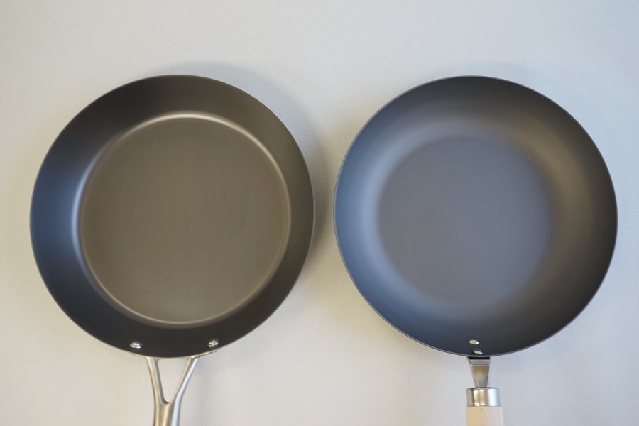 意外と盲点なのは、フライパンの裏側です。 何よりもお手入れしやすいことがポイントですが、どちらも一枚板でフラットな面となって 汚れがたまりやすいところはありません。 それでも、縁周りは、丸みを帯びている方がさっと洗いやすいでしょう。 加えて、ハンドルの接合周りに注目して下さい。 極JAPANの方が接合部分が小さいので、その点では、よりお手入れがしやすいです。