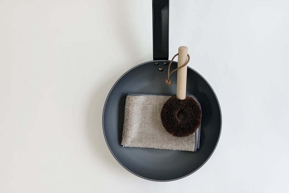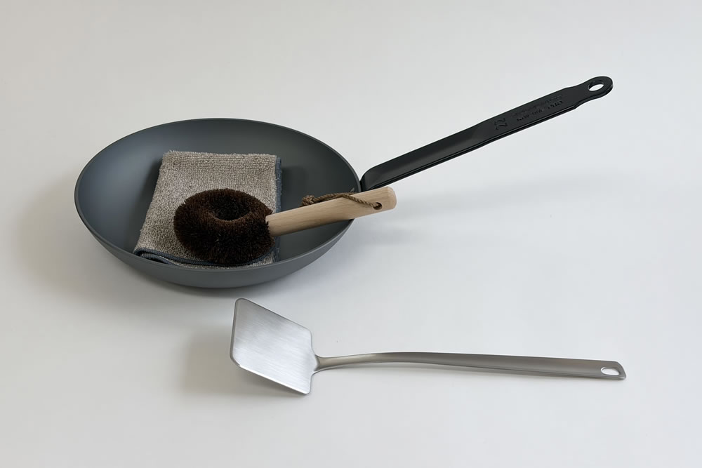 続いて、お手入れの道具です。意外と盲点となるのですが、これがあることで快適にお手入れができます。 そのため、フライパンのこびり付きを回避することにつながり、フライパンを快適に使い続けることができます。 それが、手を汚さずに洗浄できるFR・棕櫚フライパン洗い。 調理後は、こちらでざっとお湯を流しながらさっと磨くだけです。 そして、フライパンを拭き上げるには、FR・パイルクロス。こちらは、油の飛び散ったコンロ周りの拭き上げにも有効です。 この拭き上げ作業で、油汚れと焦げをきちんと除去できます。