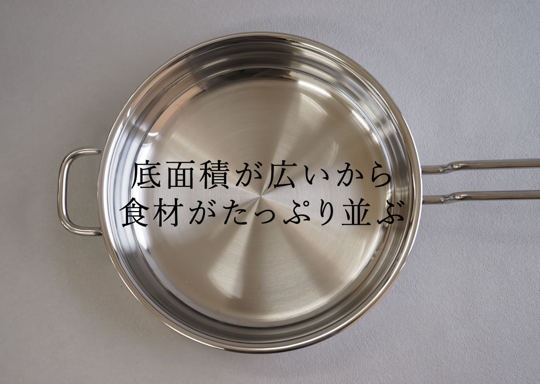 底面が広いので、食材をたくさん並べることができます。一度にたくさん調理できます。 直径も大きく底面も広いので4〜5人家族向きのサイズ感。