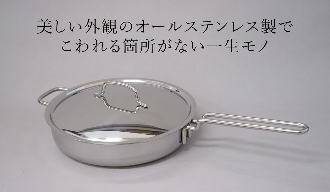 上質なステンレス素材の7層構造。熱の伝わりがよく、蓄熱性にも優れます。 板の厚みがしっかりあるので一旦フライパンをよく温めれば、後は弱火で調理できます。経済的です。 重み(約1920g)もそこそこありますが、安定感のある重みです。 (オール熱源対応:IH対応)