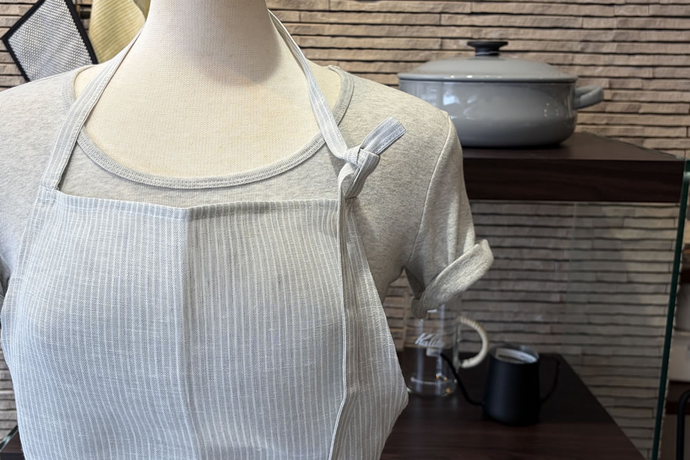 上質な薄地のリネンを使い仕立てました。リネンは丈夫で乾きが早く衛生的、エプロンの素材に最適です。