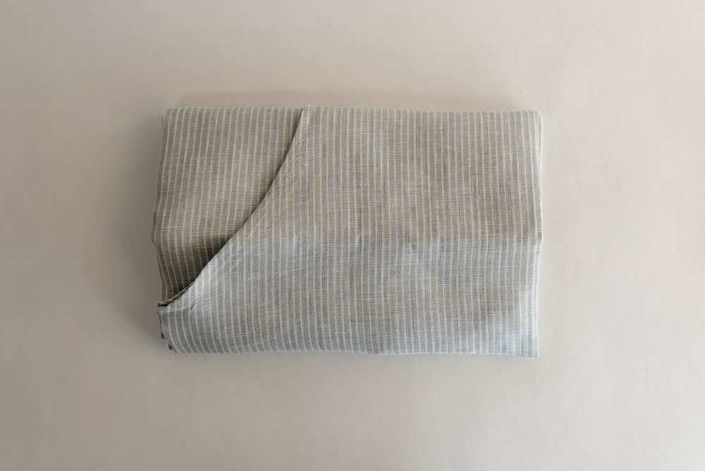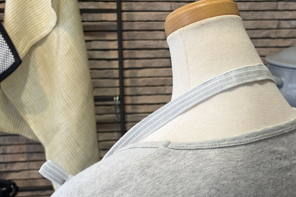 薄地の高級リネンで仕立て、軽やかに着用いただけます。 アイスグレーに白く細いラインが入っています。 コントラストも控えめなので、どんな装いともマッチするエプロンです。 清潔感たっぷりです。